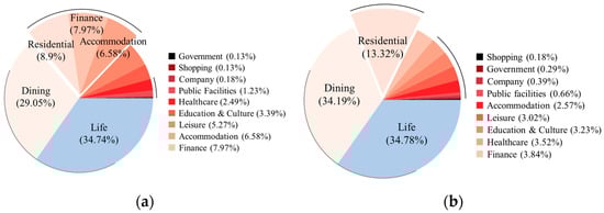 Proportion of different types of POIs: (a) Experimental Area I; (b) Experimental Area II.