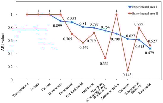 Figure 15 further illustrates the ARI values of building grouping results for different semantic categories. The results show that the grouping performance of transportation, leisure, financial, and government buildings is relatively excellent, with ARI values close to or exceeding 0.9, indicating that these categories have prominent semantic features and high grouping accuracy. In contrast, although residential and old residential buildings are more numerous, the grouping performance of some of them is relatively poor. In Experimental Areas I and II, the ARI values for residential buildings are 0.479 and 0.527, respectively, and the ARI value for old residential buildings in Experimental Area II is 0.569. The reason for this phenomenon lies in the fact that the grouping of residential buildings is highly dependent on residential POI data, which often suffers from missing data, directly causing fluctuations in grouping accuracy: when residential POI data are complete, grouping accuracy is high, but when POI data are missing, grouping accuracy significantly decreases. Moreover, old residential buildings also lack residential POI support, and the POI types around them are more complex, potentially including leisure, commercial, and other categories, which causes semantic confusion and increases the difficulty of grouping. The grouping of company buildings in Experimental Area II shows the worst performance, with an ARI value of only 0.143, mainly due to the small sample size of company buildings (only 6), with the insufficient sample size exacerbating the uncertainty of the grouping results.