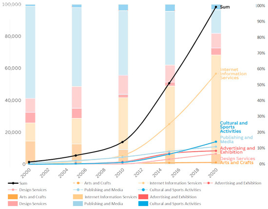 Since 2000, the number of cultural and creative industries in Harbin has increased year by year with a growth trend resembling exponential growth. Among them, the internet information services industry has grown the most rapidly, increasing from 223 enterprises in 2000 to 56,625 in 2020: a 254-fold increase. The arts and crafts industry has grown the slowest, rising from 50 enterprises in 2000 to 1237 in 2020. Other cultural and creative industries have experienced more moderate growth (Figure 3).