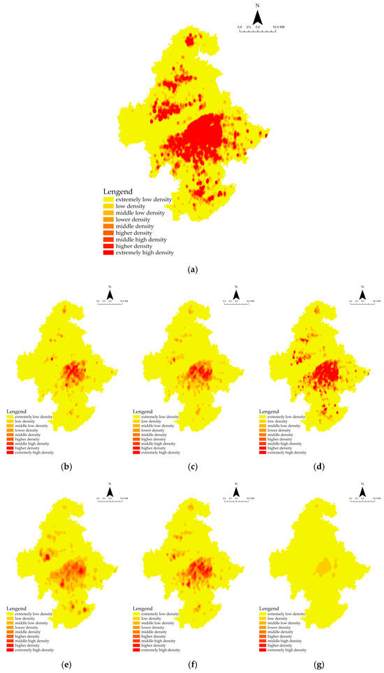 Kernel density map of cultural and creative industries in Harbin. (a) Kernel density map of all cultural and creative industries. (b) Kernel density map of the publishing and media industry. (c) Kernel density map of the advertising and exhibition industry. (d) Kernel density map of the internet information services industry. (e) Kernel density map of the design services industry. (f) Kernel density map of the cultural and sports activities industry. (g) Kernel density map of the arts and crafts industry.