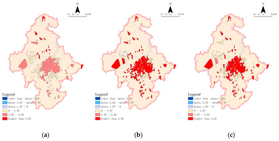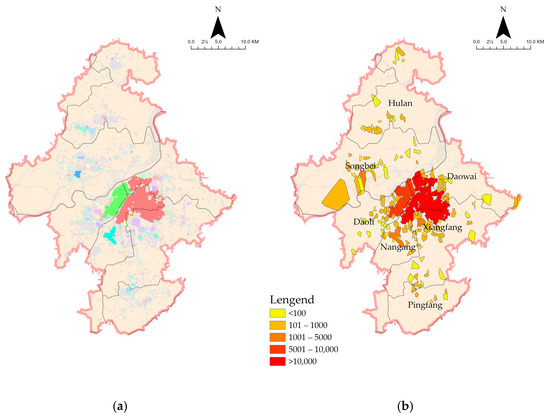 Overall, the cultural and creative industry agglomeration areas formed in old urban areas such as Nangang District and Daoli District are characterized by many enterprises, extensive areas, and broad coverage. The old urban areas have developed two super-large-scale agglomeration areas. One agglomeration area covers 44.15 square kilometers and is home to 33,579 enterprises. The other agglomeration area spans 16.28 square kilometers and includes 8284 enterprises (Figure 5b).