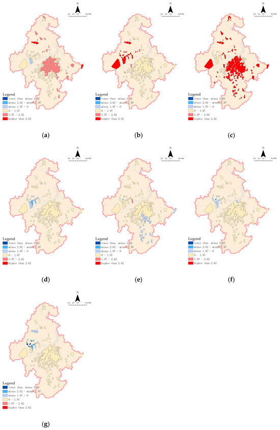 In examining the six types of industries, Xiangfang District is found to have the highest agglomeration of internet information service enterprises, accounting for 48.23%. Daowai District has the highest agglomeration of arts and crafts enterprises with 29.85% of such enterprises. Nangang District hosts the most enterprises in the publishing and media, advertising and exhibition, design services, and cultural and sports industries with agglomerations of 43.71%, 38.74%, 45.05%, and 40.34%, respectively. The agglomeration of all six types of cultural and creative industries is the lowest in Pingfang District, where none exceed 2.00% (Figure 4b–g and Table 5).