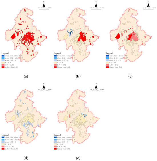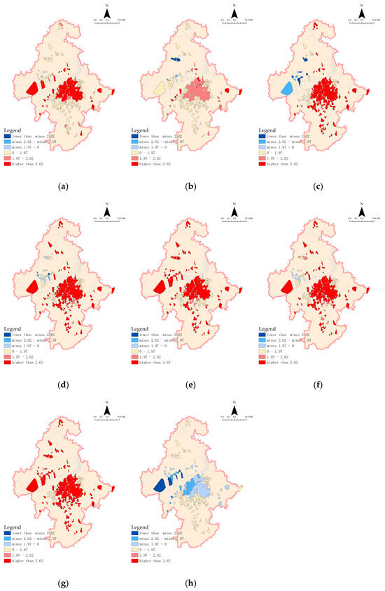 The results of the global Moran’s I index (Table 4) show that all cultural and creative industries have positive Moran’s I values, indicating the presence of agglomeration characteristics. The design service industry exhibits a strong agglomeration feature. In contrast, the low agglomeration of the publishing and media industry may stem from a decline in the demand for physical space due to digital transformation, reflecting the lagging transformation of traditional media in Harbin. The p-values for all types of cultural and creative industries show significant characteristics, suggesting that the cultural and creative industries in Harbin exhibit agglomeration.