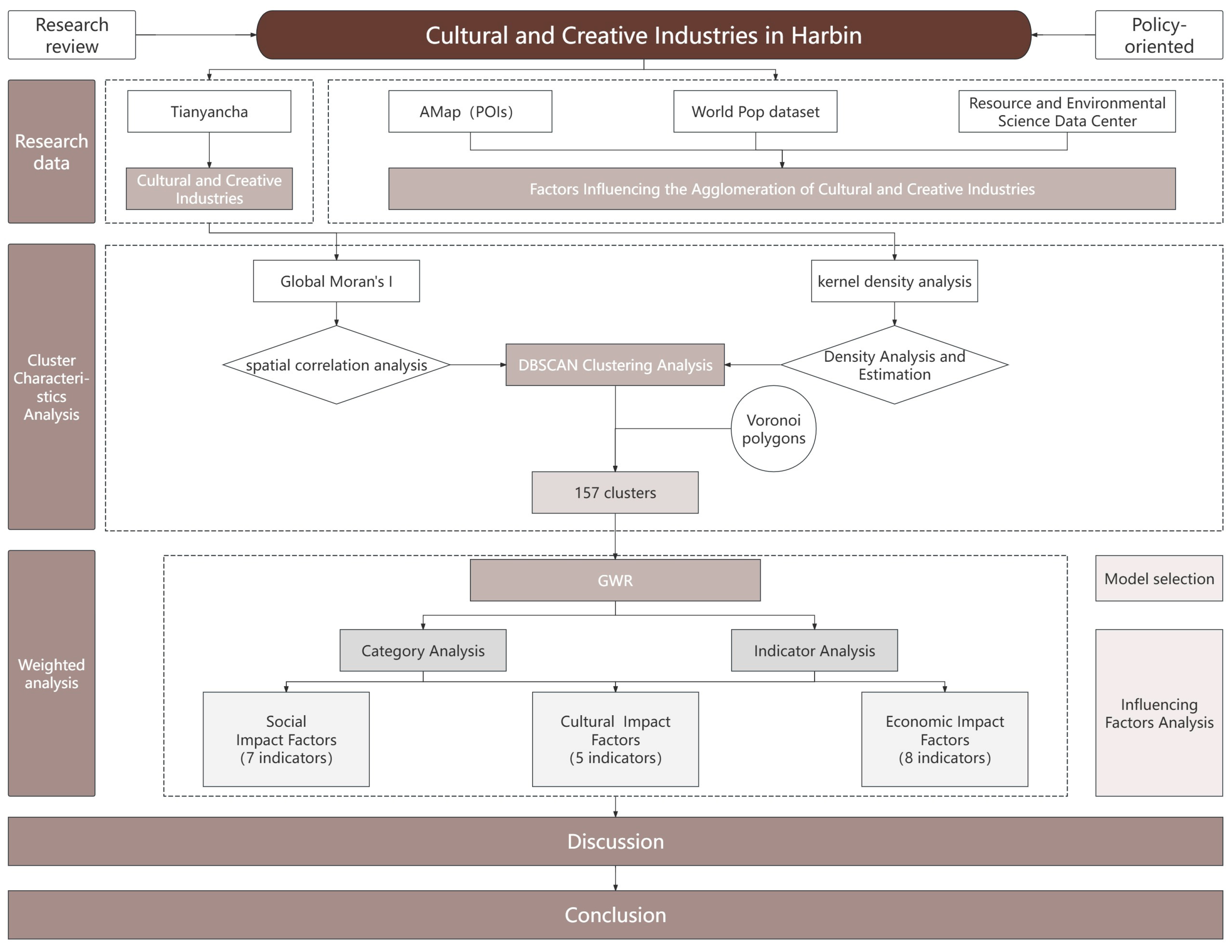 This study follows the logical framework of “feature identification–mechanism analysis–policy response” to construct a composite analytical framework based on social support, cultural regulation, and economic dominance. By analyzing factors influencing the spatial aggregation of cultural and creative enterprises within different industrial clustering areas, establishing an analytical paradigm of “micro-data–intelligent algorithms–spatial models–policy responses”. Furthermore, from the practical perspective of industrial development, it proposes a stratified management strategy based on spatial heterogeneity, providing a scientific basis for site optimization, facility support, and policy design for Harbin’s development as a “City of Creative Design”. Additionally, it offers references and insights into the cultural and creative industry planning of similar industrial cities.