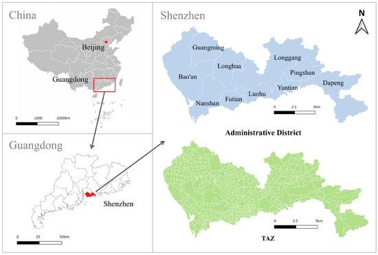 Study area’s geographical location and administrative divisions are depicted alongside a TAZ map. The images on the left show Shenzhen’s location, while the top right image displays the administrative divisions of the study area. The bottom right image illustrates the TAZ divisions within Shenzhen.