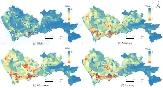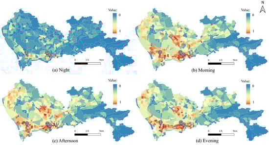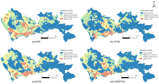 The UHMVM that we proposed in this study includes three factors: activity intensity, temporal continuity, and activity connectivity. To comprehensively explore the spatiotemporal patterns of urban vitality, each factor is analyzed through separate sub-models: the Activity Intensity Model (AIM), the Temporal Continuity Model (TCM), and the Activity Connectivity Model (ACM). As the dimensions of the three sub-models differ, their values are normalized. In the UHMVM, each sub-model is assigned an equal weight of 1/3, reflecting the balanced coexistence of the three dimensions discussed in the Methodology Section, ensuring that no single dimension dominates the overall assessment of urban vitality [29]. While equal weighting offers a parsimonious and generalizable baseline, we acknowledge that the relative importance of each component may vary depending on the specific urban context. In addition, to more accurately measure these data, the study employs a quantitative method to categorize vitality values into four predefined levels: low vitality, medium-low vitality, medium-high vitality, and high vitality. The criteria are as follows:
