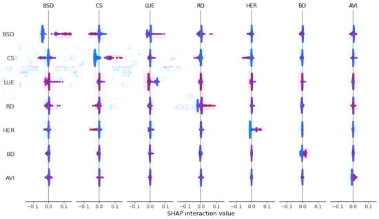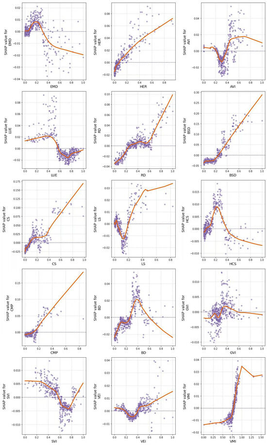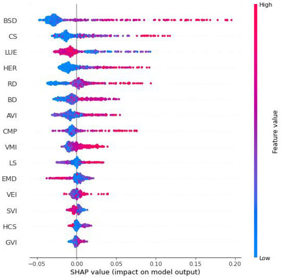 The SHAP model provides a theoretically grounded approach to interpret machine learning predictions [58]. Based on the Shapley value concept of cooperative game theory, this method quantifies the contribution of each feature to model predictions while maintaining desirable mathematical properties [59]. For a given machine learning model f and a data sample x, the predictive value of the model can be expressed as the sum of all the SHAP characteristic values plus a baseline value, which is the expected value of the prediction of the model. The specific formula is as follows: