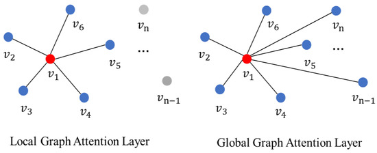 Figure 1. Local graph attention layer vs. global graph attention layer. - Sensitivity to fixed spatial scales. Most existing studies focus on a fixed spatial scale, such as census tracts, traffic analysis zones (TAZs), and fixed-size grids. However, researchers have found that the performance of human mobility inference is highly sensitive to the spatial scale of analysis units [22,23]. Identifying a model-friendly scale of spatial analysis unit can further enhance the inference performance of models.