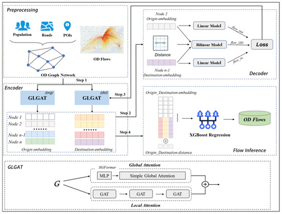 This section describes the overall framework of the proposed hybrid model GLGAT-XG for the spatial inference of OD flows. As shown in Figure 2, our model consists of four components: preprocesssing, encoder, decoder and flow inference.