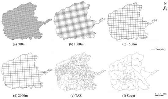 In addition, from the definition of OD flow data mentioned in Section 1, it is clear that they are typically aggregated based on spatial analysis units. As can be seen in Table 1, most of the existing OD flow inference studies are based on predefined spatial analysis units, whereas the size and shape of the spatial analysis unit can significantly affect the results, i.e., the modified area unit problem (MAUP). Several empirical results show that the effectiveness of crowd flow inference models significantly depends on the spatial scale of analysis [22,23]. This indicates that many studies ignore the scale sensitivity of spatial data distribution, i.e., the relationships between different attributes vary with scale. Therefore, Wang et al. explored the effects of different spatial scales on cross-city human flow inference based on 500 m × 500 m and 1000 m × 1000 m spatial units [38]. Guo et al. checked the generalization ability of their model on OD datasets at different spatial scales in several cities [39]. However, the above studies did not further investigate the impact of using different scales of spatial analysis units in the same city on the performance of the model.