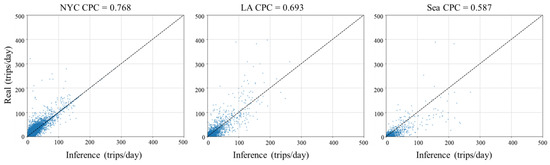 Figure 5 shows the distribution of the inferred and true results of the proposed model on the three city test sets. Looking further at the city subplots, it can be found that most of the scattered data of our model in NYC are distributed near the diagonal line, and the data in LA and Seattle are more scattered compared to NYC. In Seattle, it is easier to overestimate the inference value, and the effect becomes worse compared to the former cities. This may be due to differences in urban structure and OD flow data collection methods between cities. Notwithstanding, the performance of the proposed method on all metrics remains superior among all methods and exhibits effective generalization.