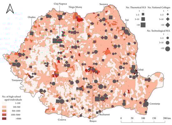 The largest urban centres and surrounding periurban areas contain almost 50% of the high school-aged population: Bucharest (70,856), Iași (13,973), and Craiova, Galați, Constanța, and Cluj-Napoca (surpassing 10,000 each). Similarly, but on a smaller scale, large rural areas from eastern and north-eastern Romania and from southern and south-eastern areas contain a significant number of high school-aged individuals.