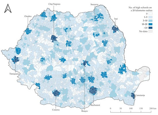The scarcity of diverse spatial data limits the results. Due to the lack of zip code data and population-weighted centroids, we assumed that the origin point of the analysis is the centre of each LAU2, as previously used in several studies at the national level in Romania [20,84]. The geocoding of such a consistent number of high schools may, in certain situations, not overlap with the exact location. In the case that an institution has several headquarters, the location of the main one, where the legal address is positioned, was used. These cases were limited to just five occurrences.