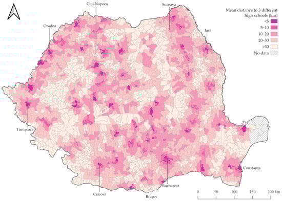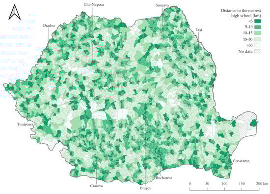 The travel distance analysed was the shortest one along the street network, which is considered more accurate and reliable in terms of accessibility than other forms of distances that might generate significant errors when measuring accessibility at the national level [85,86]. When considering the cost unit of the OD Matrix, studies have integrated both travel distance and travel time, with the latter mentioned as more important when accounting for accessibility, especially for health services because of the emergency dimension they pose [20,84]. However, as most high school students in Romania rely on public transportation solutions, for which the API code could not offer accurate results, this study uses distance as its main unit analysis. It should also be mentioned that generating the OD Matrix was not possible for some areas overlapping the Danube Delta because transportation is provided by boats. Thus, certain LAU2 were excluded from the analysis, which is explained in the respective figures and is marked with “No data” in all the tables.