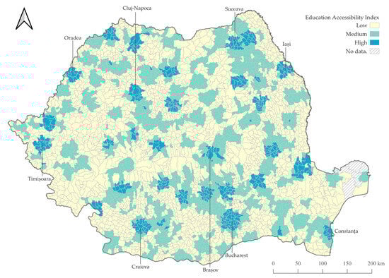 The present study aimed to evaluate the urban–rural divide in education provision in Romania based on the spatial accessibility of the high school network. We used geospatial analysis to examine the spatial distribution of the high school network and measure the spatial accessibility of educational units. Travel distance was used to measure the spatial accessibility of high schools, considering three dimensions that cover the principles of proximity and possibility of choice specific to educational services. The dimensions of availability, proximity, and diversity were integrated into the Education Accessibility Index (IEA).
