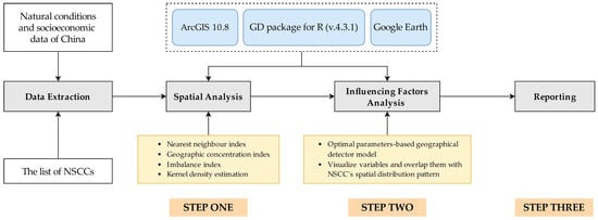 This study adopted well-established indices and models widely accepted in geospatial research to investigate the NSCCs. Figure 2 presents a flowchart of the research methodology. The nearest neighbour index was used to analyze the spatial distribution patterns. In contrast, the geographic concentration and imbalance indices were employed to differentiate the spatial distribution disparities. Kernel density analysis was applied to examine the spatial distribution density. The geodetector and spatial superposition models were utilized to measure the influence of natural and socioeconomic factors on the distribution.