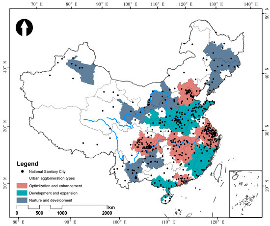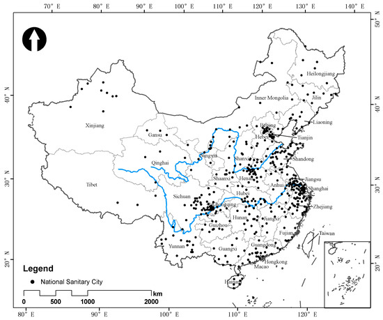 Currently, research on the NSCC policy focuses primarily on its evaluation and impact. Related studies have revealed the importance of establishing NSCCs in improving ecological welfare performance and the multiple effects it generates [8]. Studies have focused on the core elements of urban health, such as green buildings, natural infrastructure, and community participation, exploring their roles in enhancing urban residents’ quality of life [9,10]. Others have focused on healthy city planning in specific regions or countries, analyzing the socioeconomic factors influencing urban health development and policy design and implementation effectiveness [11,12]. Additionally, a few studies have taken a more macroscopic perspective, examining the relationship between healthy cities and global issues such as urban safety, ageing, and climate change [13,14]. In public health and urban planning, the effective utilization of spatial information technology (e.g., geographic information systems and remote sensing) is crucial for uncovering spatial patterns, identifying influencing factors, and promoting urban health equity and sustainable development. For example, Xie et al. used geospatial indices and ArcGIS spatial analysis to reveal the clustered distribution of leisure villages in China, highlighting the impact of natural and socioeconomic factors [15]. Similarly, Zhang et al. employed quantitative indices and the geodetector model to examine the distribution of National Forest Cities in China, linking social environmental factors to green space inequality [16]. These methods provide valuable references for analyzing the spatial patterns of NSCCs. However, existing studies on urban health often focus on singular aspects, overlooking the interplay between policies, social determinants, natural factors, and geographical disparities. This is particularly evident in the lack of research exploring how national policies can be integrated with local initiatives to tackle health inequities. Given China’s vast territory and uneven distribution of cities, population, and economy, disparities in public health resources and health equity are inevitable [17,18]. Therefore, it is necessary to investigate the spatial distribution of NSCCs and the factors driving their development. Furthermore, for China, there is an urgent need to investigate how to leverage the national government’s administrative mechanisms and resource advantages to create environments that meet the standards of sanitary cities and provide feasible strategies for achieving health equity. Such research is essential for clarifying the spatial dimensions of health equity, promoting health equity within the NSCC policy framework, and, on a broader scale, guiding governments at all levels to jointly create urban spaces conducive to the health of all Chinese residents, even worldwide.