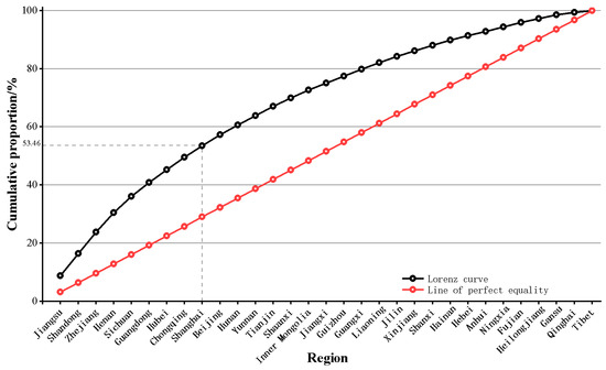 To quantify the degree of uneven distribution, the imbalance index (Formula (3)) was applied. The resulting imbalance index for the NSCCs was S = 0.3525 with 0 < S < 1, indicating an uneven distribution across the administrative regions. This demonstrates that the distribution of NSCCs across the administration regions is not uniform. The Lorenz curve, used to chart the variation in the number of NSCCs by the administration regions in Figure 5, shows an upward convex trend. Notably, the combined total of NSCCs in Jiangsu, Shandong, Zhejiang, Henan, Sichuan, Guangdong, Hubei, Chongqing, and Shanghai accounts for 53.46% of the national figure, further highlighting the uneven distribution of NSCCs.