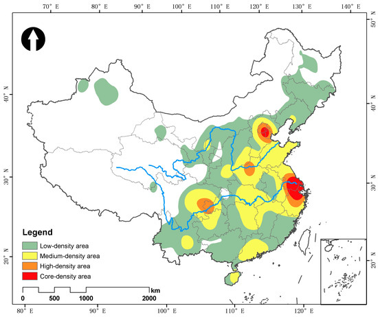 We used the kernel density tool in ArcGIS 10.8 to reveal the clustering of NSCCs. Its spatial distribution characteristics were as follows: “Dual cores, dual centres, multiple scattered points, and regional extensions”, as shown in Figure 6.