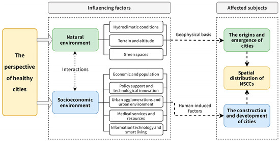 From the perspective of healthy cities, two main factors are crucial for understanding the spatial distribution of NSCCs: the natural environment and the socioeconomic environment [14,40], as illustrated in Figure 7.