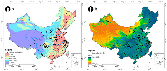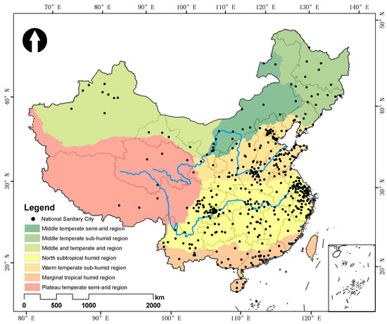 We conducted spatial overlay analysis between the NSCC distribution and China’s seven climate zones [16,45]. As shown in Figure 8, nearly 87% of NSCCs are located in areas with an annual accumulated temperature over 3400 °C and annual precipitation exceeding 400 mm, indicating that environments with favourable hydrothermal conditions are conducive to establishing and developing sanitary cities. In contrast, only 2% of NSCCs are situated in the highland climate regions of the West. Recent epidemiological evidence indicates significant spatial heterogeneity in China’s mortality rates under both high and low temperatures, with cold effects dominating the overall mortality burden [46]. The current pattern indicates that geographic differences in hydrothermal conditions are a major factor influencing the distribution of NSCCs, constraining the direction of their spatial spread and potential expansion areas.