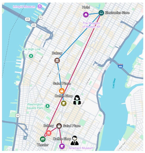 The trajectories of two users with a friendship relationship on different dates, with the exact locations retrieved from Google Maps based on the check-in data of the two users from the real-world FourSquare dataset.