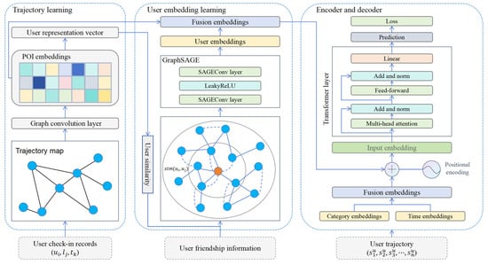 The proposed TraFriendFormer model is illustrated in Figure 2 and consists of three components. (1) Trajectory Learning: We construct a global trajectory flow graph and use a graph convolutional network (GCN) to learn POI embeddings. Based on user check-ins, we build a weighted interest representation vector for each user. (2) User Embedding Learning: We combine implicit friendships (based on user representation vectors) and explicit friendships (based on user social relationships) to construct a user social graph. The GraphSAGE model is used to learn user embeddings. (3) Encoder–Decoder: In addition to POI embeddings and user embeddings, we also consider timestamp embeddings and POI category embeddings, which are fused into a check-in embedding vector. Finally, we use a Transformer encoder–decoder framework to output POI predictions.