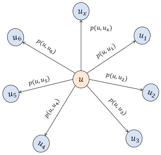 In this equation, represents the interaction weight between users and , reflecting the behavioral similarity between the two users. We use to construct the user social graph , where nodes represent users and edges indicate social relationships between users. A threshold is introduced, and, if the interaction weight exceeds , an edge is established between the two users; if is less than , the edge is filtered out. The user social graph is shown in Figure 3.