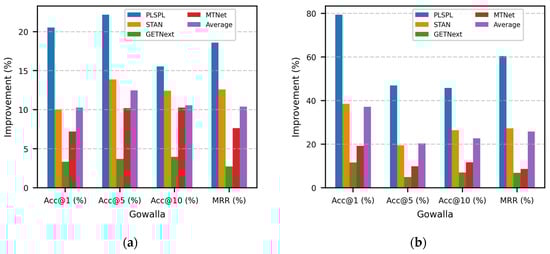 Performance improvements of TraFriendFormer compared to baseline models. (a) Improvement on FourSquare. (b) Improvement on Gowalla.
