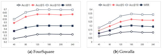 In this section, we demonstrate the impact of the POI and user embedding dimensions on the model performance, where the POI and user embedding dimensions are set to be equal. Generally, larger embedding dimensions provide stronger expressive power, but excessively large dimensions may lead to overfitting. We varied the dimension from 40 to 240, with a step size of 40. In terms of Acc and , the results of TraFriendFormer with different embedding dimensions are shown in Figure 6. It is evident that, as the embedding dimension increases, the performance gradually improves, and, after 120 dimensions, it starts to converge. The performance reaches its peak when = 160. Further increasing the dimension to 200–240 causes slight fluctuations or a minor decline in the metrics, indicating that excessively high dimensions may lead to overfitting and increase the computational overhead.