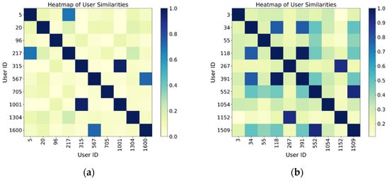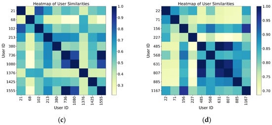 To validate the model’s ability to learn user social relationships, we conducted a visualization analysis of the user embedding vectors trained on the FourSquare dataset. We selected four groups of users based on the number of friends: fewer than 100 (a), 100 to 200 (b), 200 to 400 (c), and more than 400 (d). Users with more than 200 friends had mutual friendships, and we calculated the cosine similarity of their embedding vectors, presenting the results via a heatmap. The analysis reveals that user groups with fewer friends exhibit lower similarity, as indicated by the more scattered color regions in the heatmap. This suggests that the social relationships between these users are weak, and their check-in behavior is less influenced by social factors, as shown in Figure 7a,b. Due to the sparsity of their social networks, the model finds it difficult to capture strong social dependencies, thus leading to weaker performance in POI recommendation for these users. In contrast, user groups with more friends show higher embedding similarity and a more structured pattern. In user groups with high social connectivity, the embedding vectors of users exhibit regularity in the spatial representation, bringing together users with similar interests and behaviors. This reflects the potential influence of social networks on user behavior, as shown in Figure 7c,d.