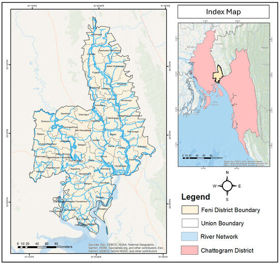 The administrative division of Chattogram includes the Feni District, which is situated in the southeast coastal region of Bangladesh (Figure 1). With a total area of roughly 928.34 square kilometers, it is among the smaller districts in the area [21]. Its topography consists of floodplains, low-lying areas, and a few elevated regions, making it highly exposed to flooding. The Feni, Muhuri, and Selonia rivers, along with intense monsoon rainfall (averaging 2500–3000 mm annually), exacerbate flood risks [21,23].