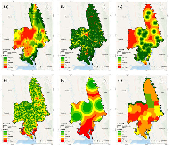 The method offers a uniform framework for understanding flood vulnerability by integrating three major indicators. The meaning of exposure in this context is the degree to which a geographical area or a demographic group is exposed to the impacts of flood hazards [46]. The term susceptibility stands for their respective intrinsic attributes that predispose them to be negatively affected [1]. Resilience is the ability to withstand or recover from floods [47]. The formula makes it clear that exposure and susceptibility contribute to vulnerability, while resilience acts to reduce it. In this way and using this formula to analyze the collected spatial data, the study succeeded in producing vulnerability maps that incorporate these components and show their relationship throughout the Feni District.