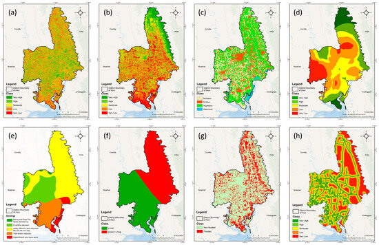 Variables under exposure: (a) Slope; (b) Elevation; (c) LULC; (d) Drainage density; (e) Geology; (f) Soil type; Susceptibility: (g) Previous flood extent; Resilience: (h) Access to road.