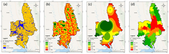 Economic vulnerability focuses on the relationship between financial stability and flood impacts (Table 1) [18]. To assess exposure, the percentage of urbanized areas (Figure 4a) is a critical variable, as urban regions often experience more severe flooding due to impervious surfaces that prevent water absorption [35].