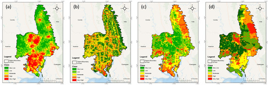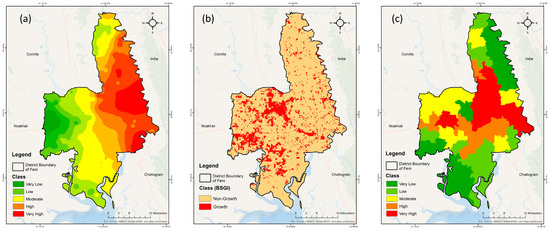 Spatial Analysis of Vulnerability in Feni District, Bangladesh: (a) Social Vulnerability, (b) Physical Vulnerability, (c) Economic Vulnerability, (d) Environmental Vulnerability.