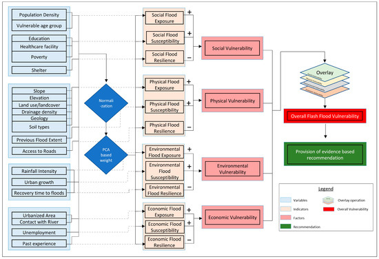 The degree to which a community, system, or asset is exposed to, prone to, and able to recover from the negative effects of a hazard is reflected in its vulnerability [11]. Flash flood vulnerability is a multi-dimensional phenomenon shaped by the interaction of social, physical, economic, and environmental factors [12]. For example, households living in low-lying flood-prone areas with weak infrastructure systems are at greater risk than those living in elevated and structurally sound areas [13]. At the same time, economically marginal groups, living under the pressures of resource inadequacies, poor health facilities, and limited access to early warning, experience high levels of vulnerability [14]. Therefore, a comprehensive assessment of flash flood vulnerability is needed, considering these diverse dimensions, in order to provide a holistic understanding of the problem [11,13].