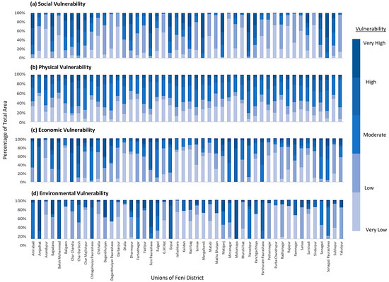 Union-Wise Breakdown of Vulnerability in Feni District, Bangladesh: (a) Social Vulnerability, (b) Physical Vulnerability, (c) Economic Vulnerability, (d) Environmental Vulnerability.