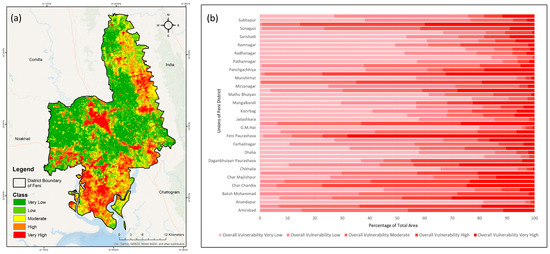 On the other hand, about 12% of the district falls into a very high vulnerability category, indicating areas where all the social, economic, physical, and environmental factors coincide to raise flood susceptibility. Studies like [53] have noted this tendency and contend that multidimensional vulnerability frameworks provide a more accurate depiction of areas that are at risk, particularly in areas that are prone to flooding. These findings imply that the flood vulnerability of the Feni District is due to a complex interplay of natural and human-induced factors, with different regions more likely than others to incur flood risks associated with physical environmental and socio-economic attributes.