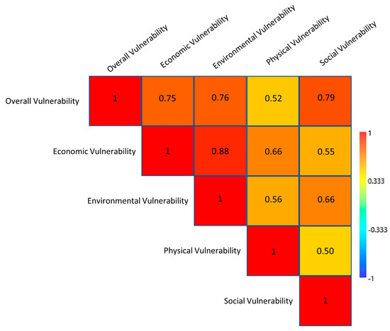 Economic vulnerability is strongly correlated with environmental vulnerability at a coefficient of 0.88, which confirms that, indeed, regions with high economic risk, for instance, unemployment and rapid urbanization, tend to be more environmentally challenged, particularly those in areas with the highest rainfall, along with rapidly urbanizing areas. There are also moderate associations of economic vulnerability with both physical (0.66) and social vulnerability (0.55), underlining the interrelatedness of infrastructure issues, poor drainage, and low elevation in relation to socio-economic concerns, such as health care access and education. Similarly, environmental vulnerability also correlates strongly with economic vulnerability at 0.88 and is moderately related to physical vulnerability at 0.56, showing that those areas with poor drainage and generally low-lying topography carry both economic and environmental risk. It is also moderately correlated with social vulnerability, at 0.66. Physical vulnerability is strongly related to economic vulnerability, at 0.66, and to environmental vulnerability, at 0.56, but less so in the case of social vulnerability, at 0.50. Among these factors, social vulnerability is highly correlated with overall vulnerability and environmental vulnerability, whereas it is moderately correlated with economic vulnerability and is poorly correlated with physical vulnerability.