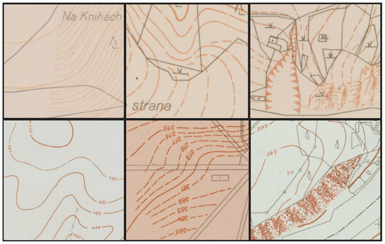 The site of interest is the upper and middle course of the Vltava River historical valley. This valley was dammed in the second half of the 20th century, and the relief changed significantly. Some maps with elevation information describe this area before this change, one of them is the SMO-5 map. Regarding difficulties presented in this dataset, the individual SMO-5 map sheets differ significantly in many aspects. The individual map sheets were combined into a seamless map. Their processing and accuracy rating are given in [13]. Being created in different years by different teams of people, the map symbology shows noticeable changes, such as slightly different colors and contrast of scanned sheets. The sheets exhibit differing elevation intervals of contours, as sheets were produced either with 1-, 2-, 5-, 10-, or 20-m contour intervals. This often creates discontinuity between map sheets with contour cut-offs. Another source of topological errors comes from elevation annotations inserted in the contour lines with spaces between digits and lines. Similar interruptions are found in some dashed contour lines, marking intermediate elevations. Another difficulty arises from the occasionally steep terrain, where contour lines appear significantly dense, to the extent of nearly touching each other.