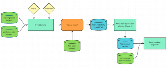 Our presented approach can be broken down into three stages. The first stage consists of training a deep neural network and creating an EPM raster by inferring the trained model on test data. The second stage comprises of multi-step vectorization pipeline, which vectorizes the EPM raster to final contours. Finally, the resulting vectors are compared to the ground truth vectors in benchmarking, allowing us to compare the results depending on various parameters. A simplified flowchart of the whole process is shown in Figure 3.