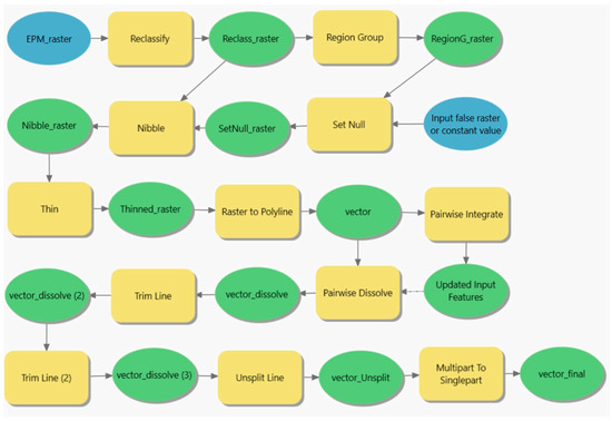 To convert the EPM to a vectorized final output, the map is thresholded at 0.5. As discussed earlier, watershed segmentation cannot be used. The binary raster is then cleaned of small pixel clusters of size less than 400 pixels and thinned with a centerline. This thinned raster is then converted to a vector. To eliminate dangling lines originating from erroneous trisections, all dangles shorter than 25 m are trimmed. This does not remove circular dangles that sometimes result from thinning. To account for this, vertices closer than 0.85 m (two pixels) are integrated before the last step. Such an operation also slightly generalizes the contours. The overall pipeline is visually described in ArcGIS ModelBuilder in Figure 4. A step-by-step explanation is provided in Appendix A.
