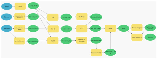At this point, we have not annotated the vectorized contours with elevation; therefore, we do not assess whether only the contours of the same value are connected. These errors would likely result in another topological error elsewhere anyway, whether an intersection or a loose end. Many individual errors occur close to each other, due, for example, to an interrupting annotation creating multiple intersections and loose ends in one place. Thus, we sum up errors located within 10 m of each other and count them as one instance of an error, because they are likely correlated and would require the attention of a human operator to fix them. The final score is represented by the generalized sum of topological errors. Figure 5 shows the process implementation in ModelBuilder, further described in Appendix B.