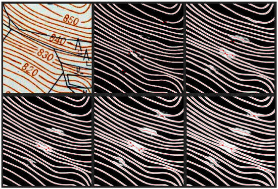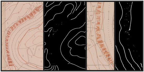 Some simpler solutions make use of Bayesian statistics to classify pixels of more homogenous areas based on their RGB values [15,16]. Similar thresholding is the core idea of the HistMapR [17] package, implemented in the R environment. For the vectorization of contours, an analogous approach was used to segment the pixels representing contours based on their RGB [14] or HSV values [18]. These approaches, however, require further manual processing, for example, manual removal of elevation annotations interrupting the contours. In addition, thresholding only classifies at the pixel level, without accounting for texture and wider context, producing many false positives. Also, the pixel values can differ based on a particular map sheet, requiring the use of different thresholding values for each map sheet, or equalizing the color balance between sheets. Nevertheless, sensitivity towards noise remains unresolved.