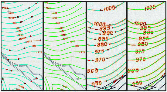 Quantitative comparison on the same map with results obtained with thresholding vectorization [14] is unfortunately difficult. The ground truth data we were provided with were already manually finished in the postprocessing, with much of the manual editing already carried out in ArcScan without any provided intermediate results. The number of errors depends highly on the choice of thresholding interval, which is selected by trial-and-error for each map sheet. This results in uneven and irreproducible results. We are, therefore, left with only a crude qualitative comparison of some areas. The absolute number of errors in Table 2 can seem quite high. This is caused by, among other things, the discontinuity between map sheets, where all available methods will also suffer huge errors. The discontinuities are caused by the often-differing symbology rules, like the contour elevation interval, sudden change to a different type of line, or the frequent vertical shift. Many contours do not have any continuation beyond the seams, and even if they do, sometimes the adjacent contour is significantly shifted along the seam. Kratochvílová and Cajthaml [14] dealt with this problem by clipping the contours 10 m before the seams, annotating the vector data with elevation, and then connecting the lines across the seams based on the elevation attributes.