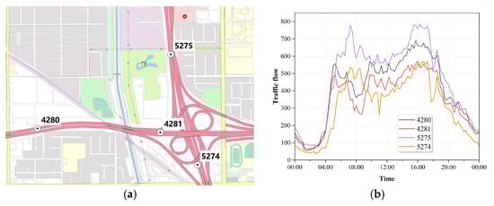 Traffic flow data also exhibit spatial correlations as the traffic conditions in different roads or areas can influence each other [15]. Congestion in one road segment can affect the traffic flow in adjacent segments. As shown in Figure 1, the traffic flow at point 5275 is strongly correlated with that at the major downstream point 5274, whereas it is not correlated with that at the minor downstream points 4280 or 4248, indicating that the traffic flow to each branch dynamically changes over time. Graph convolutional networks (GCN) learn from complex network topologies by generating convolutional kernels based on static road networks and employing aggregation functions to capture the local spatial dependencies on neighbouring nodes [16]. Therefore, GCN have emerged as an effective solution for capturing the spatial dependencies in traffic networks and have been widely applied to improve the efficiency of traffic flow prediction [13,17,18].
