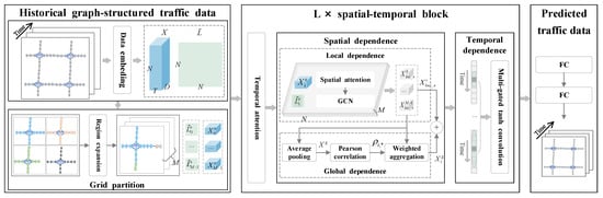 Rapidly developing social economies and urbanisation have explosively increased the number of motor vehicles using roads, leading to traffic congestion, traffic accidents, and other transportation issues [1]. Therefore, intelligent transportation systems (ITSs) have been developed by integrating sensing, communication, decision-making, and control capabilities utilising advanced technologies to effectively address conflicts between people, vehicles, and roads [2]. Accurate traffic flow forecasting based on historical and current spatial–temporal traffic flow data is critical for traffic control, guidance, and route planning within an ITS [3]. However, traffic flow forecasting remains challenging because of the complex dynamic spatial and temporal correlations and network topologies associated with traffic data. Therefore, the dynamic spatial–temporal relationships in traffic data must be accurately captured to ensure accurate real-time traffic flow forecasting [4].