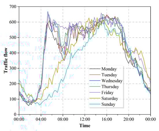 First, the traffic flow data features are embedded by transforming them into high-dimension features. These data are converted from to , where is the embedding dimension. Furthermore, traffic flow exhibits regular changes over time with flow peaks and troughs influenced by daily commuting activity in the mornings and evenings on weekdays and by weekend travel with later peaks, as shown in Figure 3. Therefore, data embedding methods are applied to model the periodicity of traffic flow by dividing a day into 1440 min and a week into 7 d to construct periodic indices. Next, D-dimensional data embedding is performed on these indices to transform the daily index from to and the weekly index from to . Finally, the data feature and periodicity embeddings are aggregated to obtain the final embedding result as follows: