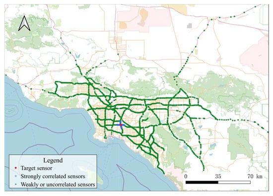 Considering the First Law of Geography, a target sensor in a large-scale traffic network will have significantly fewer sensors with adjacency relationships than without. Figure 4 shows the spatial distribution of sensors in the LargeST GLA dataset [26], in which the red points represent the target sensor, blue points represent sensors with strong correlations to the target, and green points represent sensors with weak or no correlations to the target. Using a dynamic GCN based on this entire traffic network to calculate the spatial correlation for each sensor will involve many sensors that are unrelated to the considered sensor, leading to unnecessary computation and significant memory usage. Therefore, the grid partitioning module is used to partition the entire traffic graph into regions, preserving the local adjacency relationships between sensors while reducing the number of nodes in the graph convolution network, enhancing the ability of the model to handle large-scale traffic networks. This module divides the minimum bounding rectangle of geographical feature into regular regions. Based on their spatial coordinates, road segments are assigned to the corresponding grids. Within each subgraph, the local traffic network is constructed by extracting the connectivity information among road segments from the global adjacency topology.